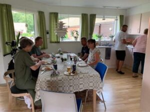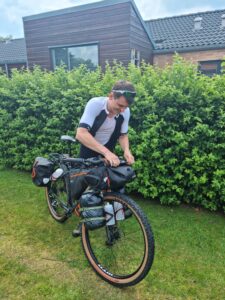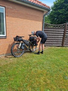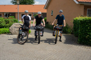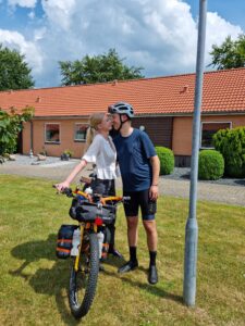 Vi mødtes i Grindsted kl. 10 og fik pakket vores cykler. Før vi satte kursen mod syd, var der planlagt fællesspisning med vores familier. Kasper og Jakobs farmor havde forberedt det helt store frokostbord med fiskefileter, frikadeller, æg og rejer og vi kunne blive ved. Der er ingen tvivl om, at det lagde en god bund for vores første etape. Efter et godt måltid trak vi i cykeltøjet, krammede familier og kæreste farvel, klikkede i pedalerne og satte ellers afsted mod sydens sol.