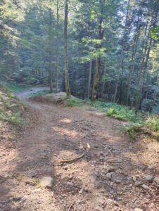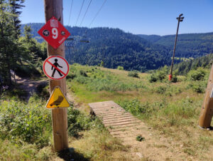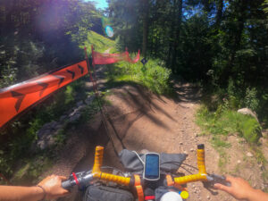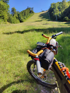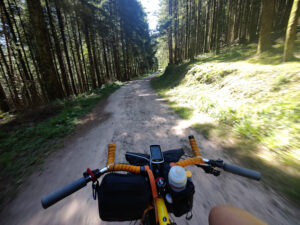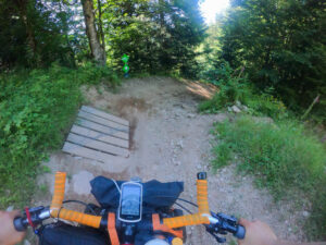 Lede stigninger, stigninger på vandrestier, downhill tracks, skiløjper og nedkørsel af klipper gjorde at jeg koldede fuldstændigt. Derudover, så tabte jeg en dunk (den sidste med vand i), rev min trøje i stykker i forhjulet, blev stoppet af politiet, fordi en franskmand var forsvundet i skoven, det blev mørkt, kørte ned af vandresti i mørke uden pandelampe (lå i autocamperen..) og nå ja, så var jeg færdig hele vejen. Heldigvis så ville Claus gerne hente mig – så jeg skulle bare lige gennem alt overstående inden det gav mening ift. vejnettet.