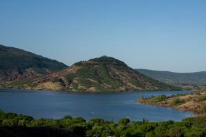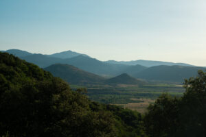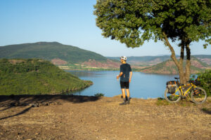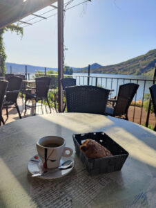Svinet fløj derudaf og den første stigning: easy peasy. På toppen var der flooot kig ud over en sø, som jeg kørte langs. Nede ved bredden kom jeg forbi en campingplads, hvorpå der var en café, som netop åbnede da svinet drønede forbi med mig på ryggen. Bedste spot til morgenkaffen indtil videre! For lige at top den helt af, så havde jeg siddet og snakket med en rigtig venlig franskmand, som lige valgte at betale min morgenkaffe som hans måde at støtte en dansk bikepacker – tak! 😍